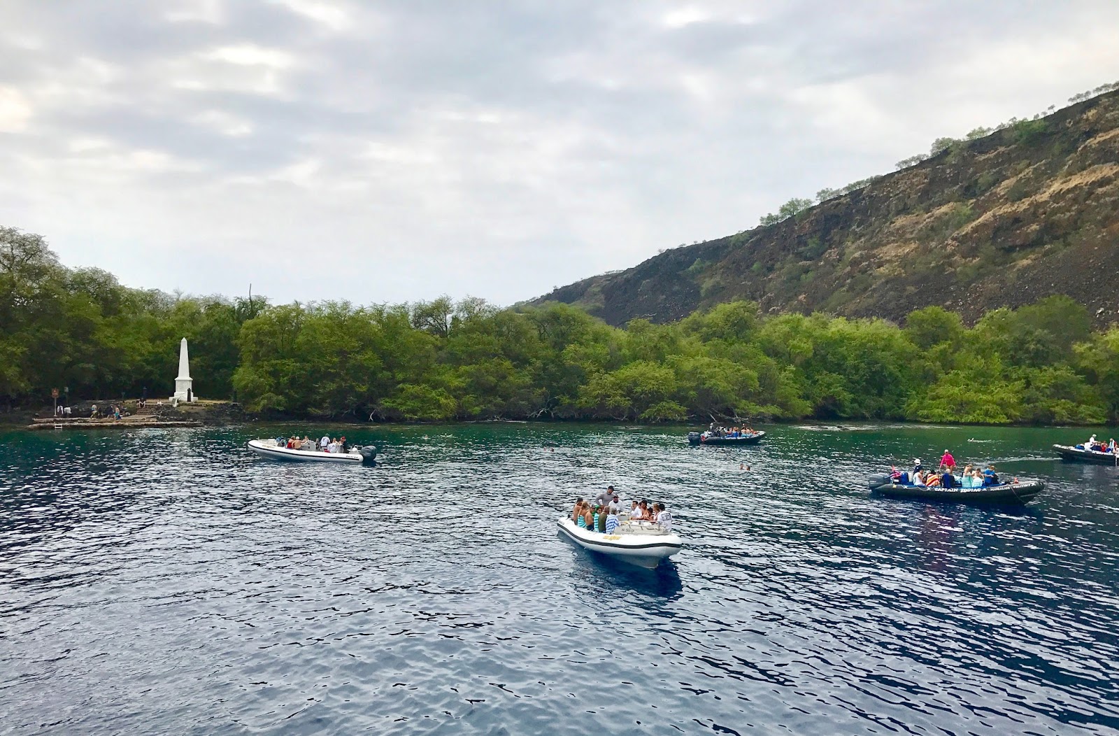 | Snorkel boats surround the monument to Capt. James Cook's landing. Photo © Judy Wells. |